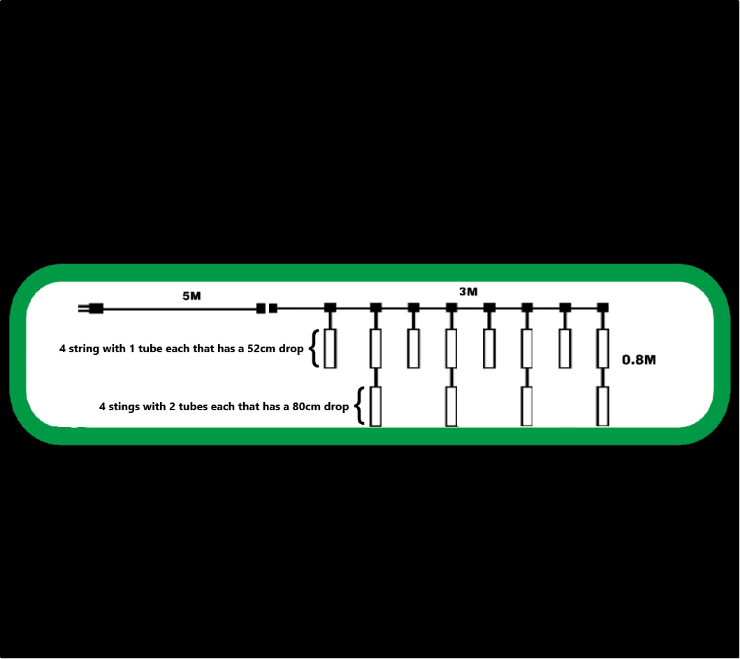4 strings with 1 tube each that has a 52cm drop | 4 strings with 2 tubes each that has a 80cm drop (see diagram)