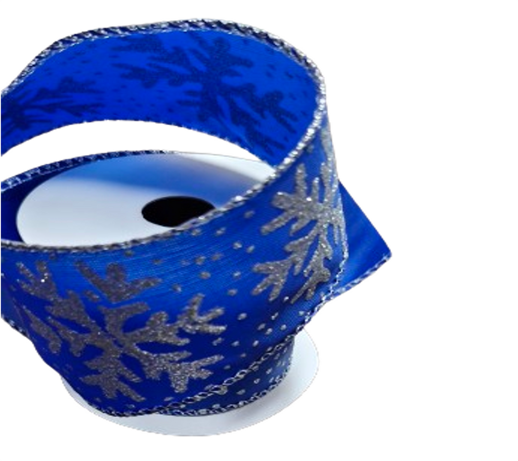 Ribbon: 2.7m (L) x 6.3cm (W) | Blue with Silver Snowflakes