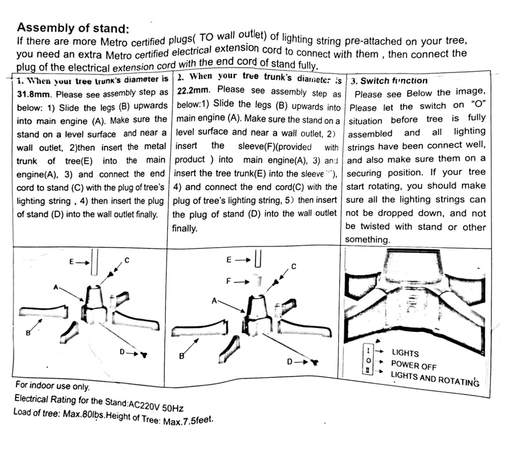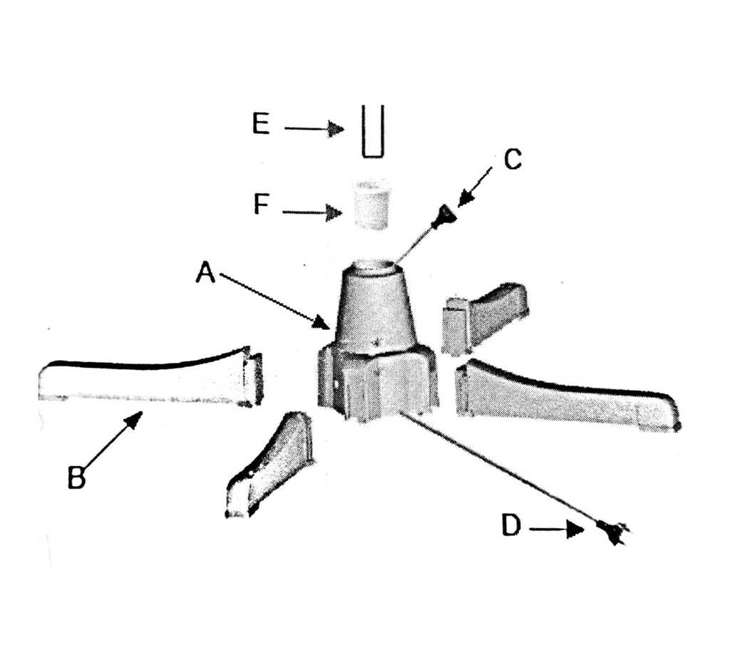 A - Main engine | B - 4 Legs | C - Cord for fairy light 2 point plug | D - Plug for engine to plug into wall outlet | E - Metal pole of tree | F - 2x Sleeves: 1x loose - can be taken out | 1x fitted in engine