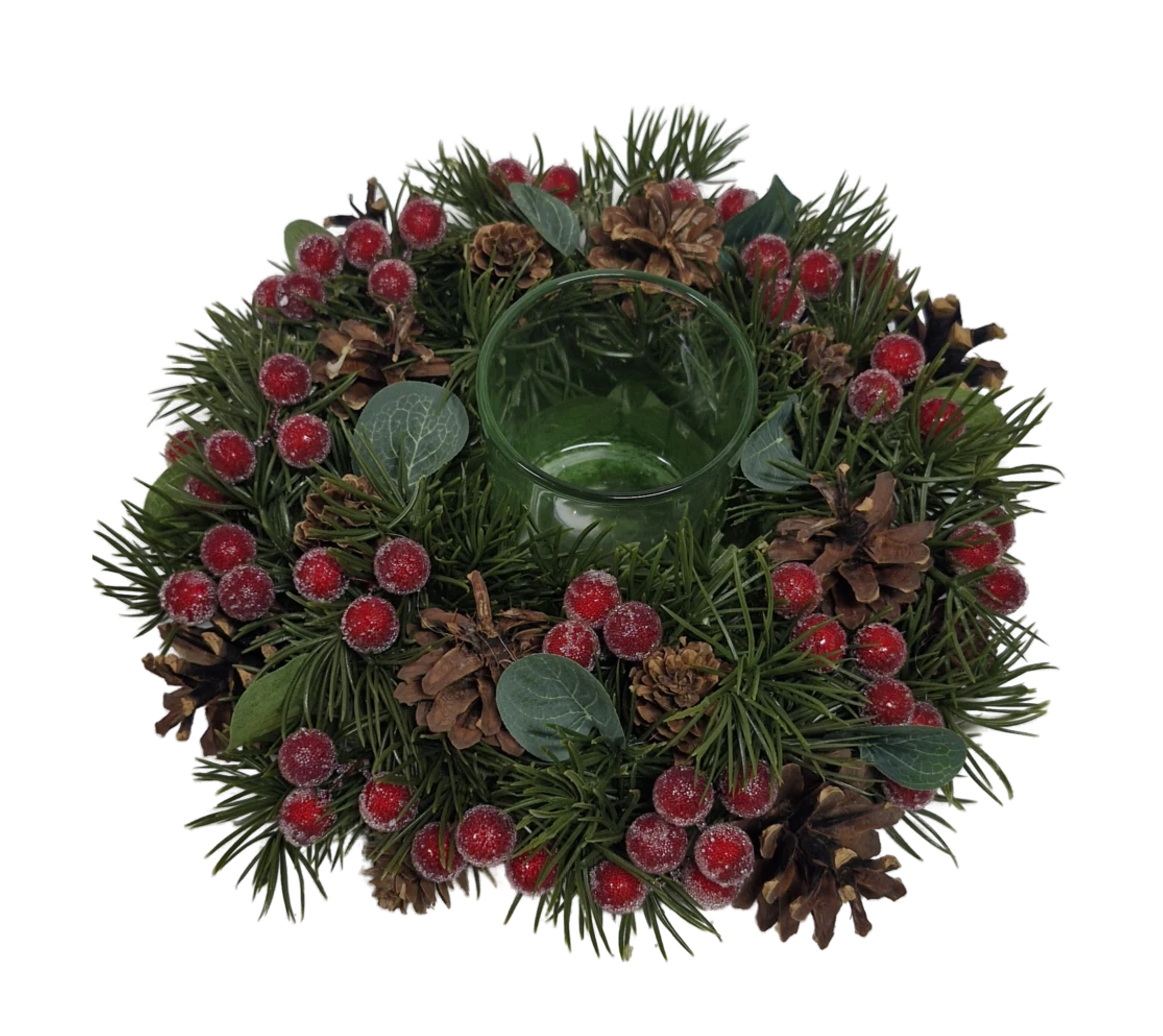 Table Décor: 26cm(D) | Frosted Berry & Pine cone wreath with candle holder
