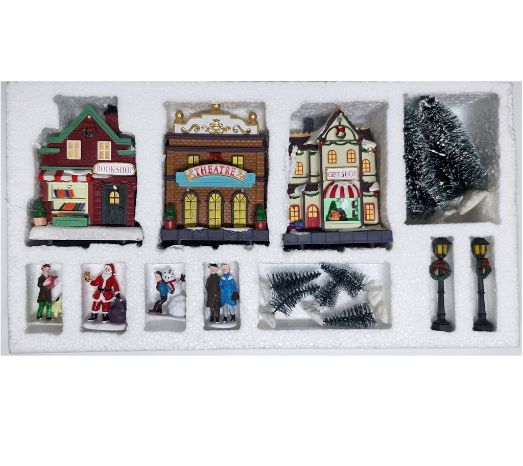 17x figurines - 3x buildings [+/- 11cm(L) x 7cm(W)] x 12cm(H) | 2 x lampposts [+/- 8.5cm(H)] | 8 x trees [ 3 x big trees +/- 14cm(H)] | 5x small trees [+/- 6cm(H)] | 1x Santa +/- 6cm(H) | 3x people +/- 6cm(H) |